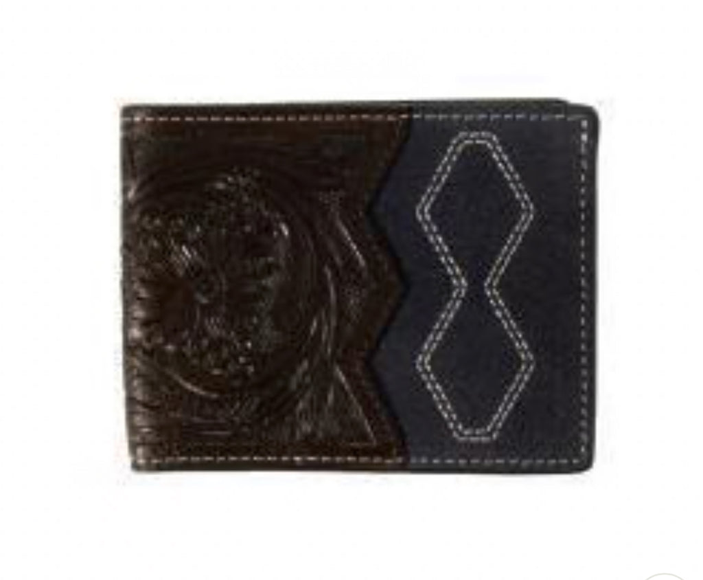 Decorative and stylish mens 3D bifold with passcase wallet. It is genuine leather with a hand tooled floral pattern. Roughout body with boot stitch accent. Multiple card slots, cash slot and ID window.