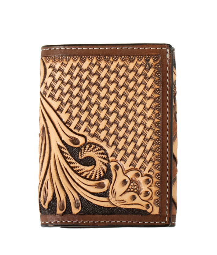 Decorative and stylish mens 3D trifold wallet. It has a genuine tan body that is hand tooled with a floral, basket weave and checkers design. Multiple card slots, a cash slot and an ID window