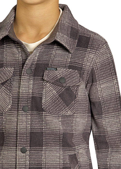 Plaid fleece shacket with snap front closure.