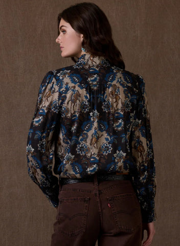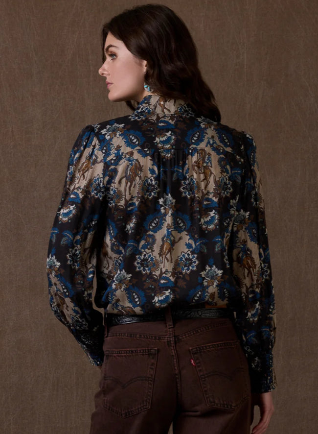 This swoon-worthy custom print brings together the significant hues of the Wash House collection in a dreamy damask with a rodeo-Western spin. This chic button-down is elevated in a luxurious viscose with a contrasting pearl snap placket and lovely smocked cuffs.