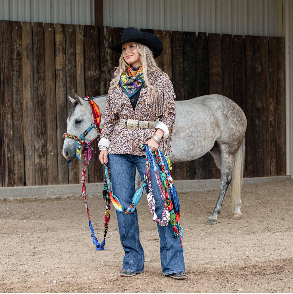 Designed by Amy Moorhouse for Fringe Scarves, Queen of the Rodeo is a vibrant tribute to Western glamour. Featuring a striking cowgirl and her loyal horse, this bold design blends vintage rodeo charm with colorful desert florals and intricate details.