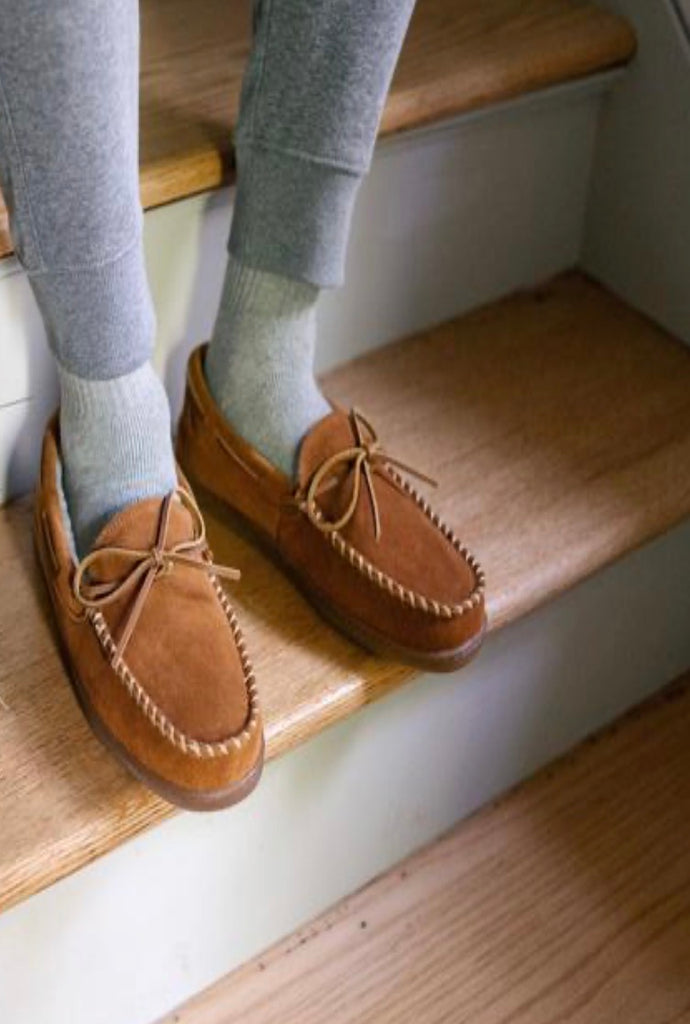 With a traditional moccasin design and specially constructed indoor-outdoor soles, these slippers are for more than just the house. Ideal for walking the dog or grabbing coffee, these moccasin slippers will keep your feet warm on chilly days. Thick pile lining cushions every step and supple suede gives these slippers a rich look and feel