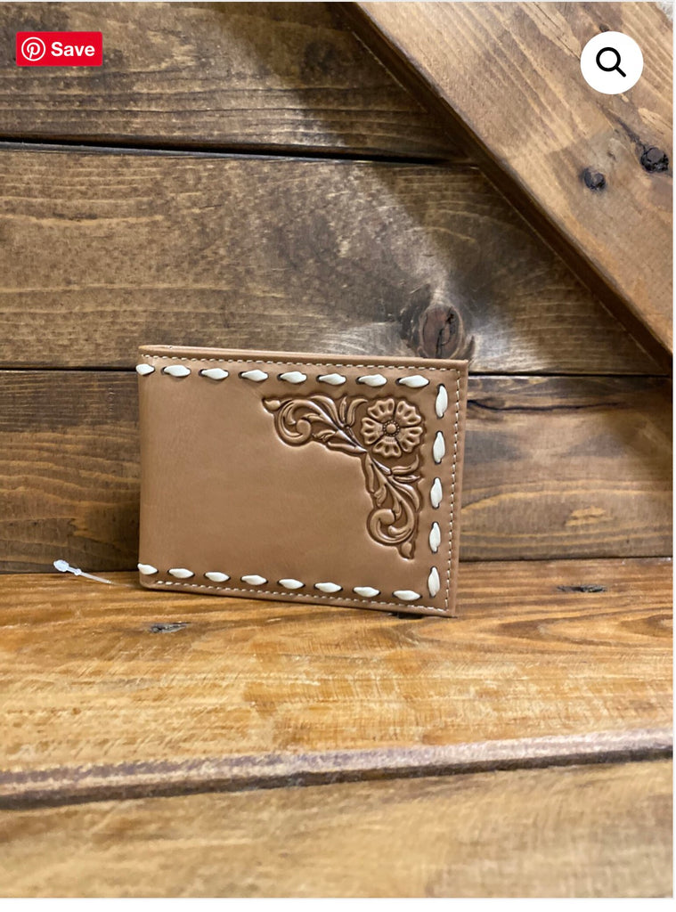 Sleek wallet made from top grain leather with a slim design. Buck stitch edging around the front of the wallet with a tooled floral design taking up the top right corner. Smooth leather back matching the front in leather with a basic stitch pattern.