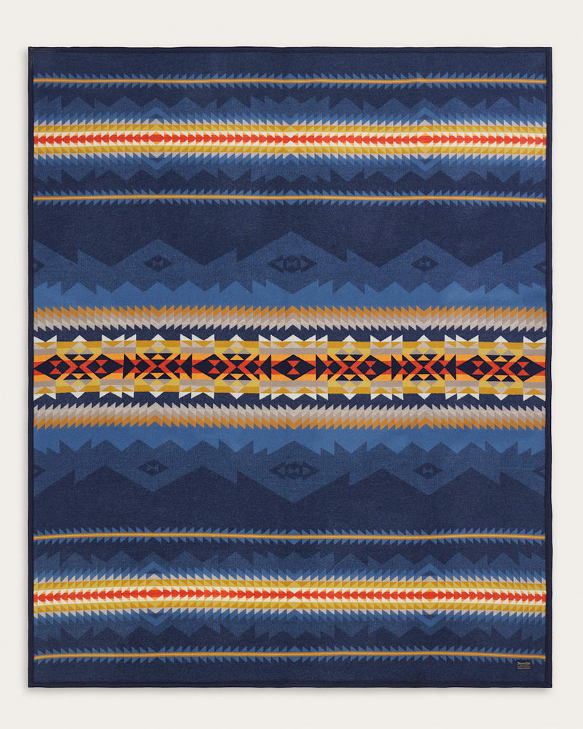 Fields of wildflowers are banded by peaks that represent the mountains of the Cascade Volcanic Arc. Also known as Cascadia, this range stretches from Lassen Peak in California, to the Silverthrone Caldera in British Columbia, Canada. The towering snow-capped peaks include Mount Hood and Mount Rainier in the Pacific Northwest. The center band represents the floral bounty that blooms in the rich volcanic soil near these dormant volcanoes: coreopsis, marigolds, poppies, and so many more.