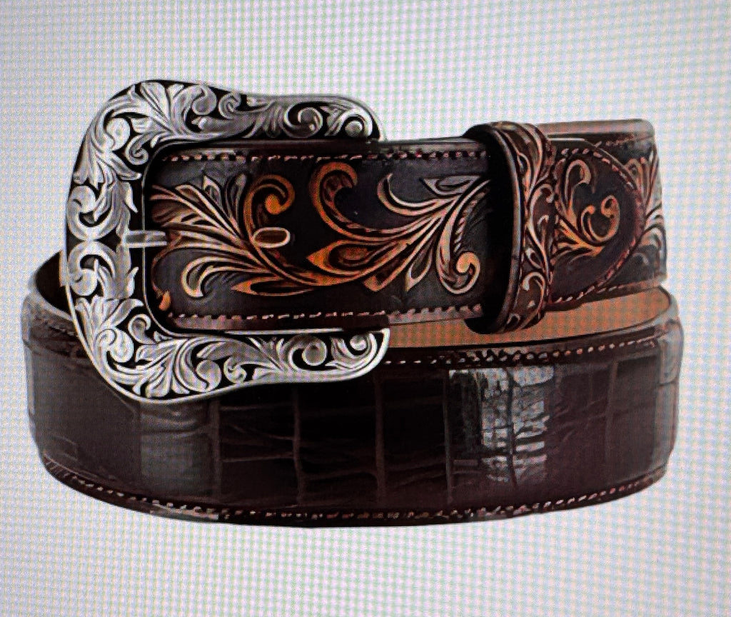 Between the tooled details, crocodile embossed leather, and detailed buckle, this belt will stand out from the crowd.