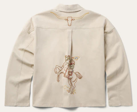 Crafted from sturdy, comfortable 100% cotton stretch canvas, this utility-style shirt jacket features intricate allover embroidery inspired by classic western iconography. It has dropped shoulders, a straight back yoke, and two large angled patch pockets with flaps.