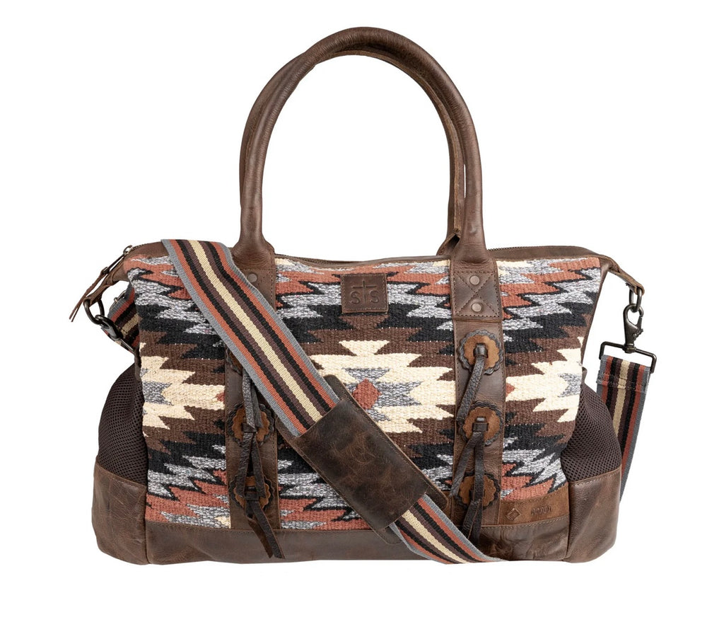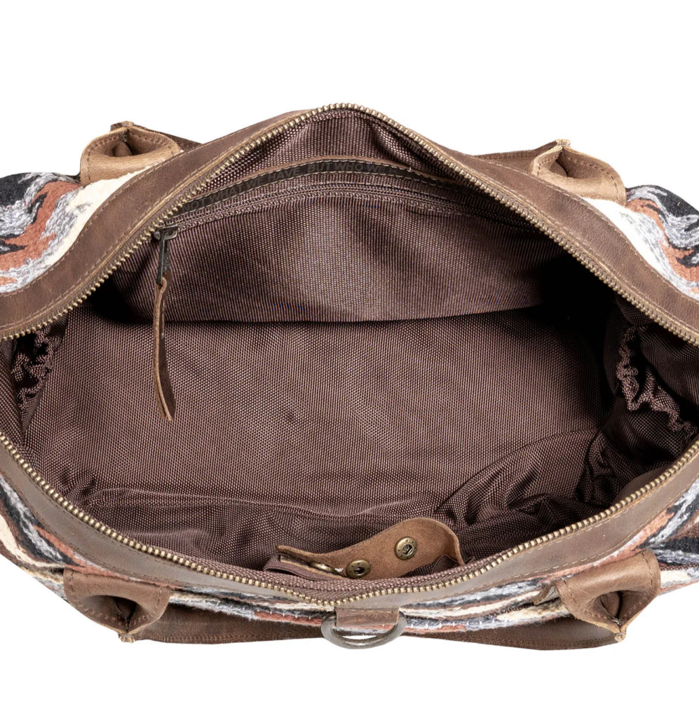 The Guadalupe Serape Amelia Multi-bag captures the essence of fall with its rich palette of browns, creams, grays and black colors and is crafted from hand-woven cotton with full grain leather accents for a timeless rustic charm.